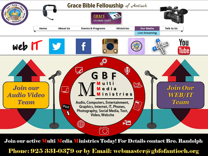 The Multi-Media Ministry's mission is to support the expansion of Grace Bible Fellowship of Antioch's (GBF) vision through the use of all forms of media.